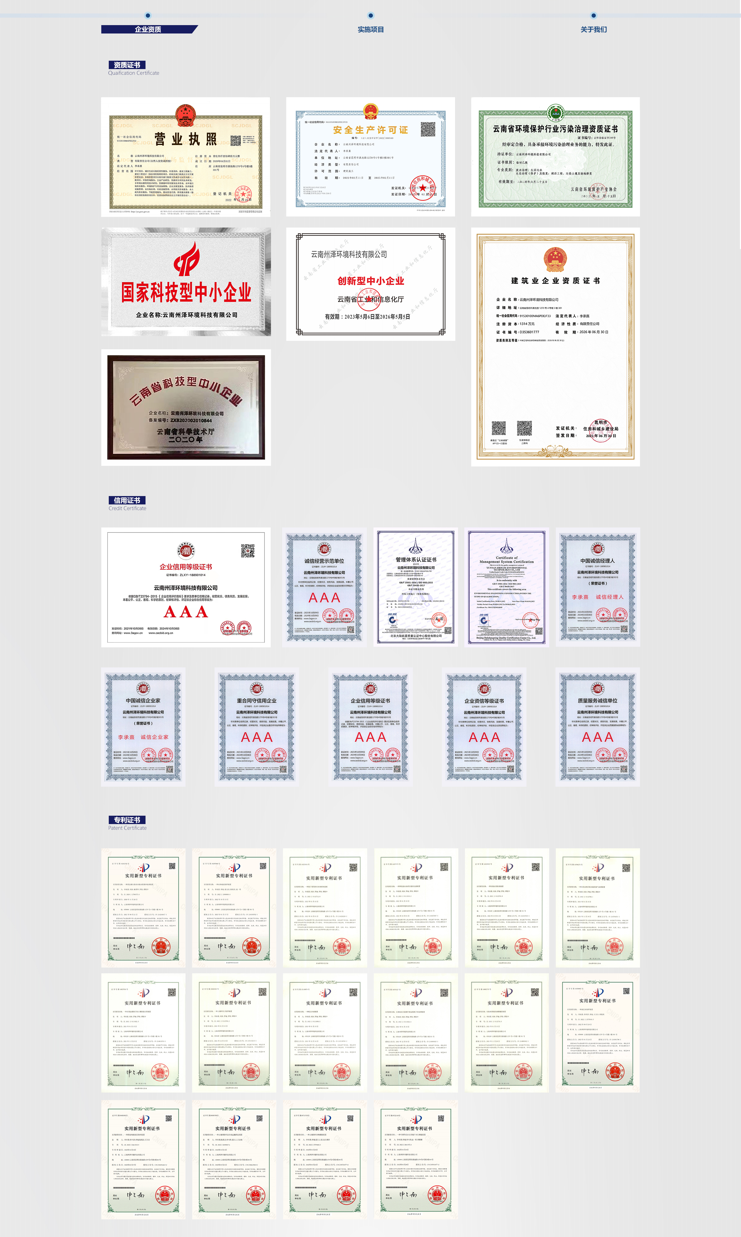 綜合服務(wù)項目業(yè)績覆蓋生活垃圾及固廢處理處置、流域水環(huán)境綜合治理、農(nóng)村環(huán)境綜合治理、工業(yè)污染場地、農(nóng)用耕地土壤修復(fù)和礦山生態(tài)修復(fù)等領(lǐng)域。具有“環(huán)保工程專業(yè)承包三級”資質(zhì),獲得質(zhì)量管理體系、AAA企業(yè)信用等級、國家及云南省科技型中小企業(yè)等證書,并取得16項專利。