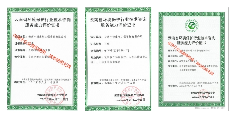 云南中揚水利工程咨詢有限公司成立于2011年,注冊資金100萬元整。公司從事的主要業(yè)務為生產(chǎn)建設項目水土保持咨詢設計(水保方案編制、水保監(jiān)測、技術評估及咨詢)、水土保持規(guī)劃、水利工程設計(農(nóng)田水利、河道)、可行性研究報告編制、土地復墾等。公司已取得水土保持方案編制、水土保持監(jiān)測、工程咨詢備案、環(huán)境污染治理、環(huán)境保護行業(yè)技術咨詢服務能力評價證書、民用無人駕駛航空器經(jīng)營許可證等資格證書,是云南省水土保持學會和云南省環(huán)境保護協(xié)會會員。