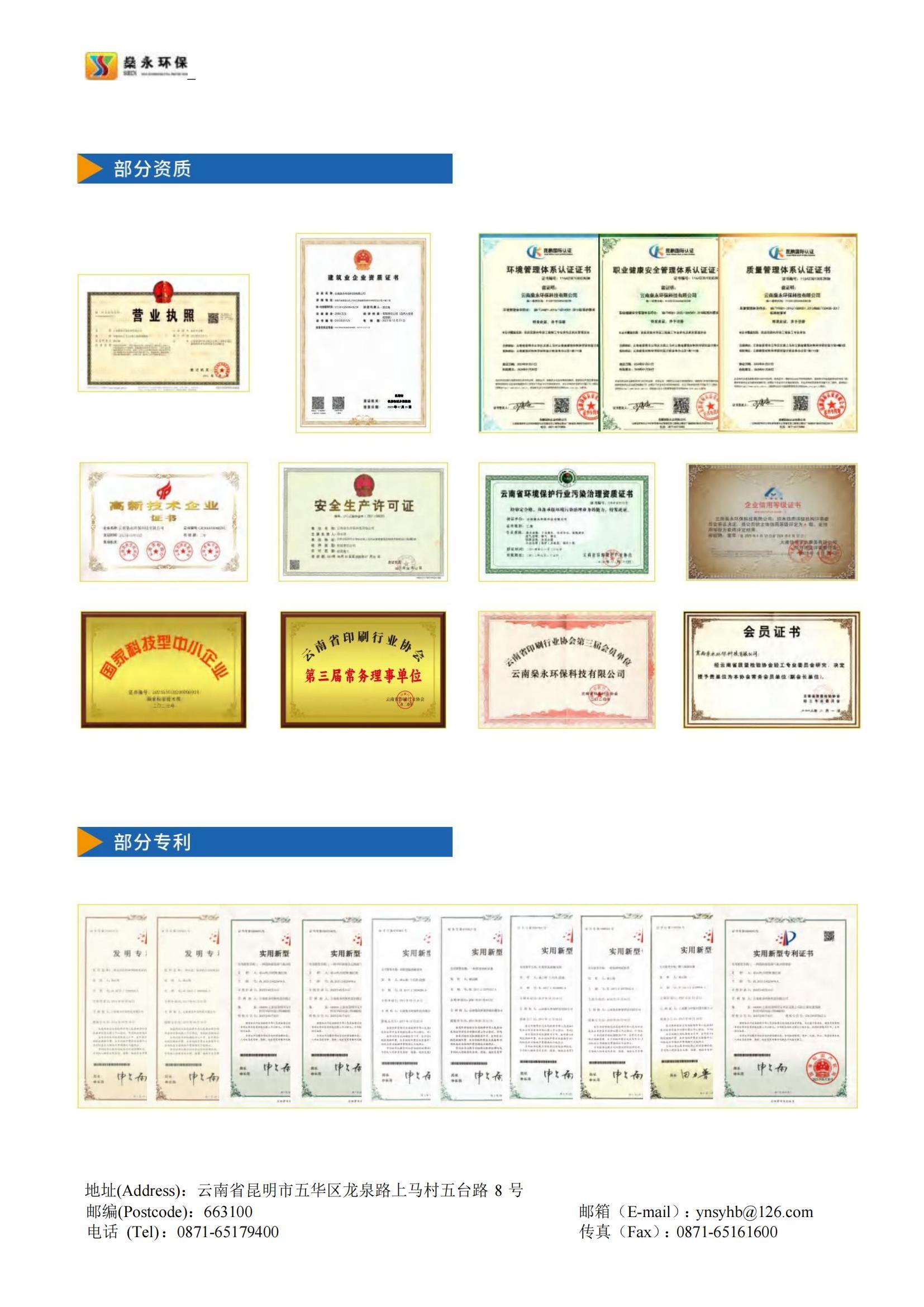燊永公司堅持“創(chuàng)新、協(xié)作、共贏”的價值觀,以“專業(yè)、專心、專注”為服務理念,以“求實、求是、求精”為質(zhì)量宗旨,為客戶提供優(yōu)質(zhì)、高效、貼心的服務。公司獲得國家專業(yè)部門頒發(fā)的《環(huán)境工程專業(yè)承包三級》資質(zhì)、《污染治理乙級》資質(zhì)、《企業(yè)信用等級A級》證書、《云南省科技型中小企業(yè)》認定證書、《ISO9001/GBT50430質(zhì)量管理體系》證書、《ISO14001環(huán)境管理體系》證書、《ISO45001職業(yè)健康安全管理體系》證書等多項榮譽和多項的專利技術。