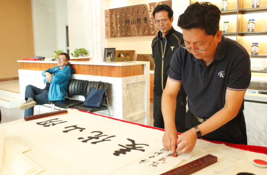隨后,大家又來到燕麥博物館,感受燕麥文化、體驗(yàn)燕麥產(chǎn)品的同時(shí),并現(xiàn)場目睹書法名家張曉華老師的揮毫潑墨。孟才介紹,中國燕麥的市場份額在100億元以上,裸燕麥起源于中國,但是國內(nèi)燕麥深加工所用的原糧90%是進(jìn)口皮燕麥,只有10%是國產(chǎn)裸燕麥,主要原因是國產(chǎn)裸燕麥多采用傳統(tǒng)旱作耕作方式,人工除草,有機(jī)種植,不使用除草劑、農(nóng)藥、化肥等,畝產(chǎn)較低。但是,也正因如此裸燕麥的口感更好、質(zhì)量更佳且蛋白質(zhì)、脂肪、β-葡聚糖等營養(yǎng)成分均高于皮燕麥。得天獨(dú)厚的資源優(yōu)勢是陰山優(yōu)麥建企立身的根基和市場競爭的底氣,產(chǎn)品全部采用優(yōu)質(zhì)的國產(chǎn)裸燕麥就是陰山優(yōu)麥的核心競爭力!